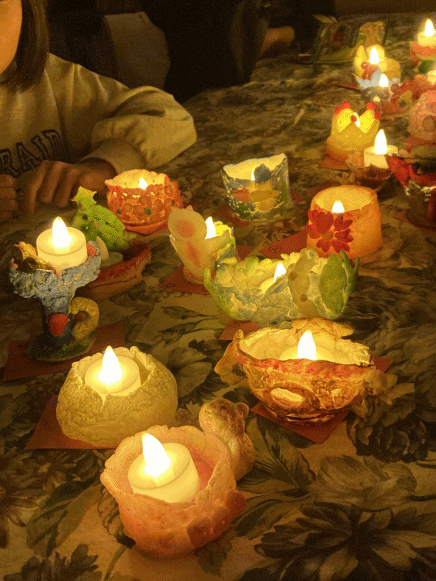 昼間は、陽の光を透して窓辺が楽しくなりました。夜になって外からみると、影絵の様です。